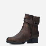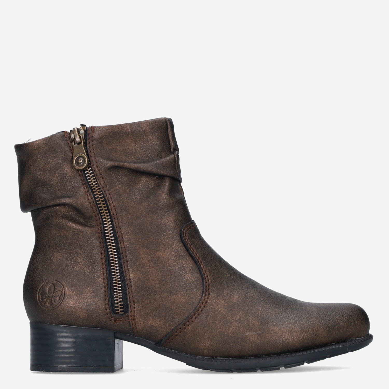 Deze bruine metallic Rock Antik damesboot van Rieker is gemaakt van leer in combinatie met synthetische materialen. De enkellaars is voorzien van een dubbele ritssluiting voor een gemakkelijke instap en heeft een hakhoogte van ongeveer 3 centimeter.