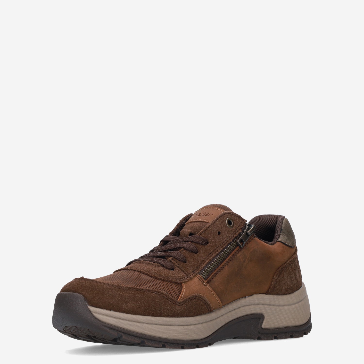 Deze bruine Samira herensneaker van Rieker is gemaakt van leer in combinatie met textiel en synthetische materialen. De sneaker is voorzien van zowel een rits- als vetersluiting voor een gemakkelijke instap.