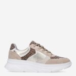 Deze beige met goude Bridge damessneaker is gemaakt van een combinatie van leer en synthetische materialen. Deze chunky sneaker heeft een sportieve dikke zool en panterprint details.