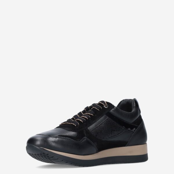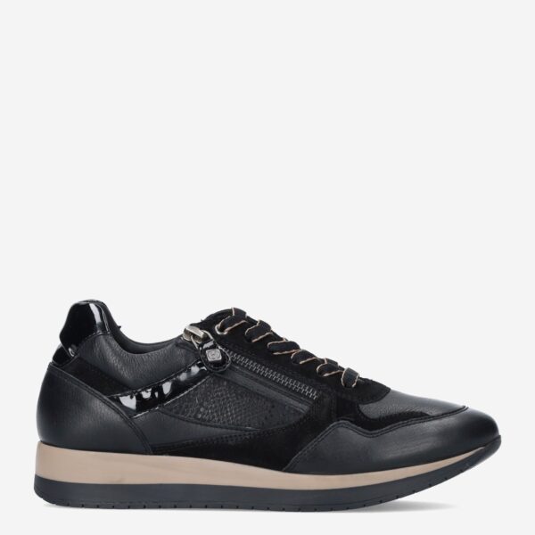 Deze zwarte Sneaker H damessneaker van Helioform is gemaakt van leer in combinatie met synthetische materialen. De sneaker is voorzien van zowel een rits- als vetersluiting voor een gemakkelijke instap.