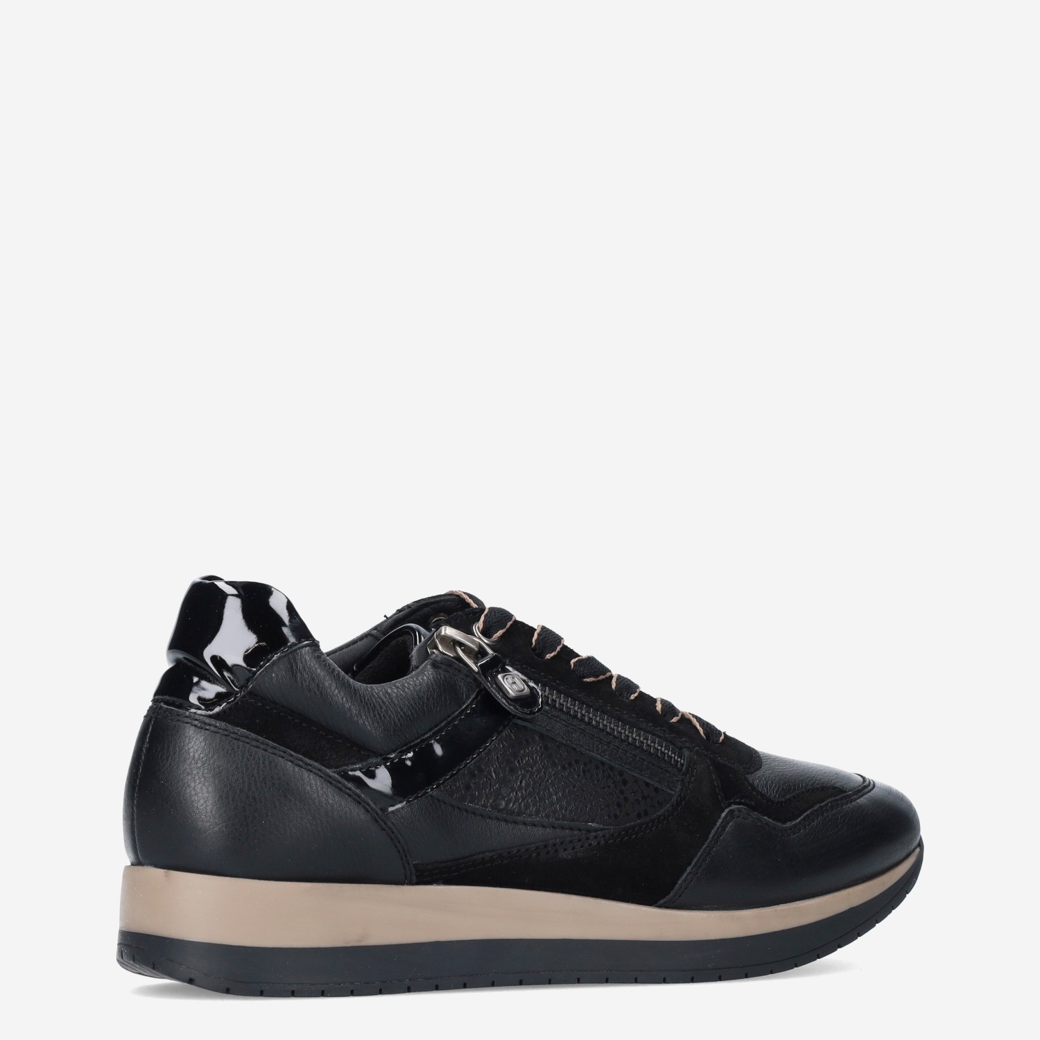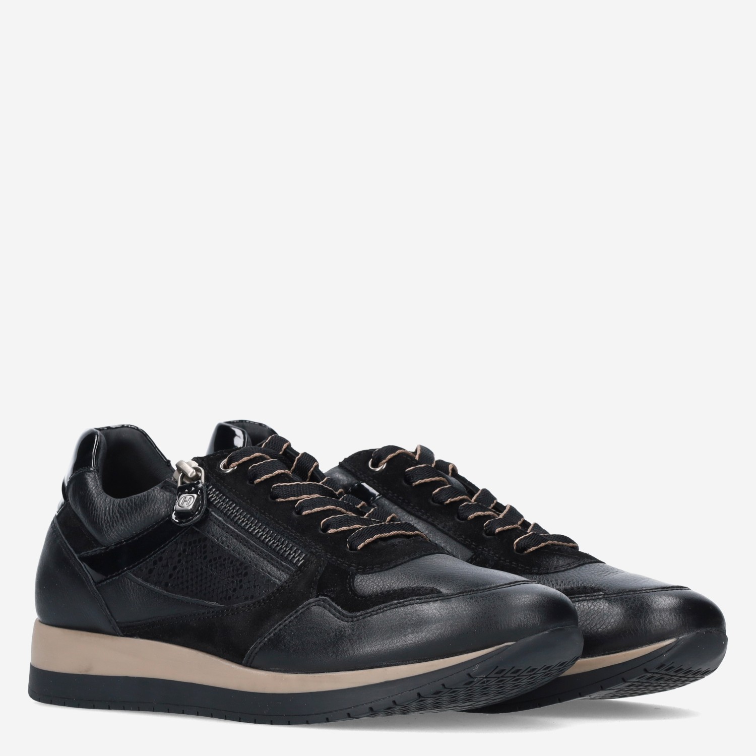 Deze zwarte Sneaker H damessneaker van Helioform is gemaakt van leer in combinatie met synthetische materialen. De sneaker is voorzien van zowel een rits- als vetersluiting voor een gemakkelijke instap.