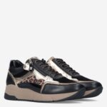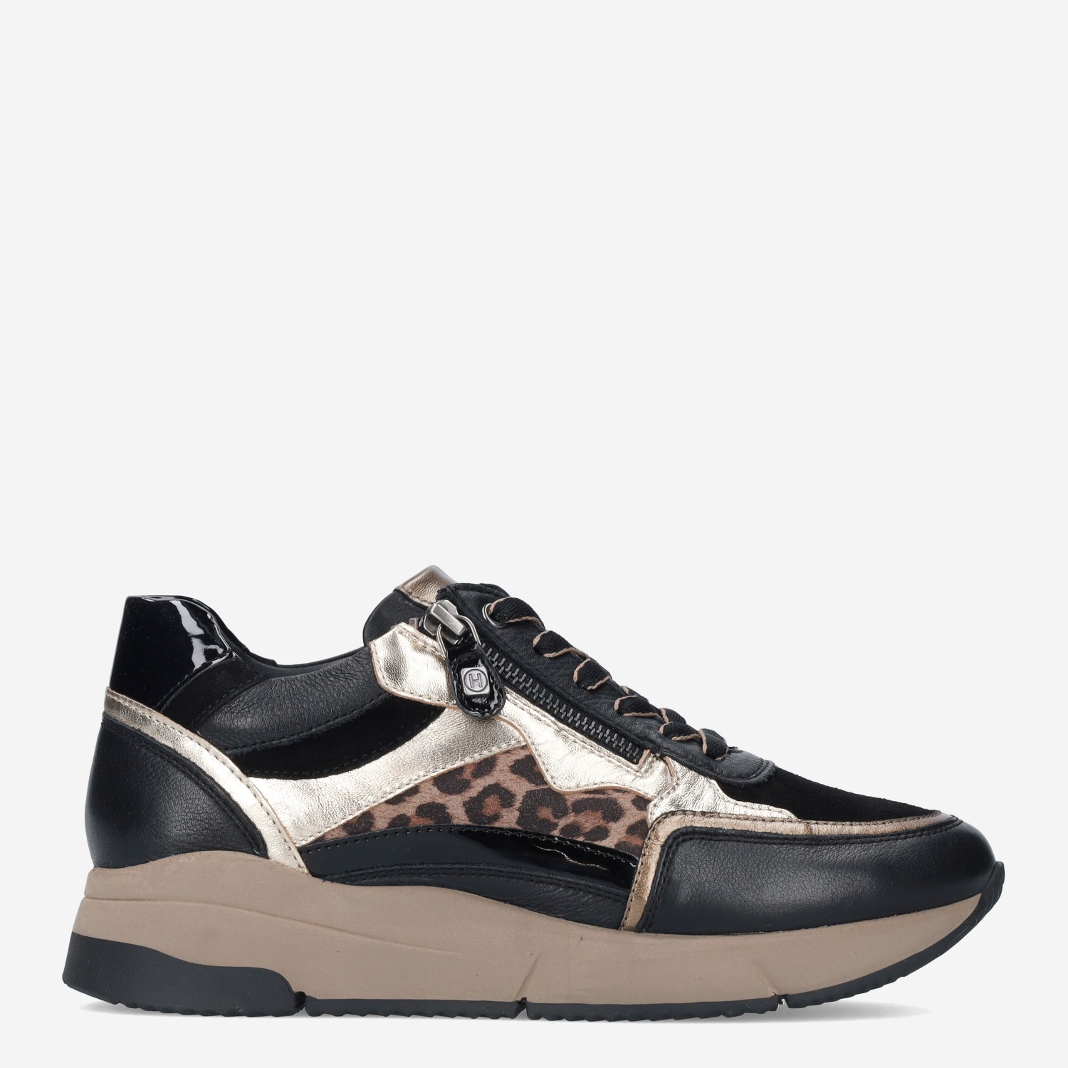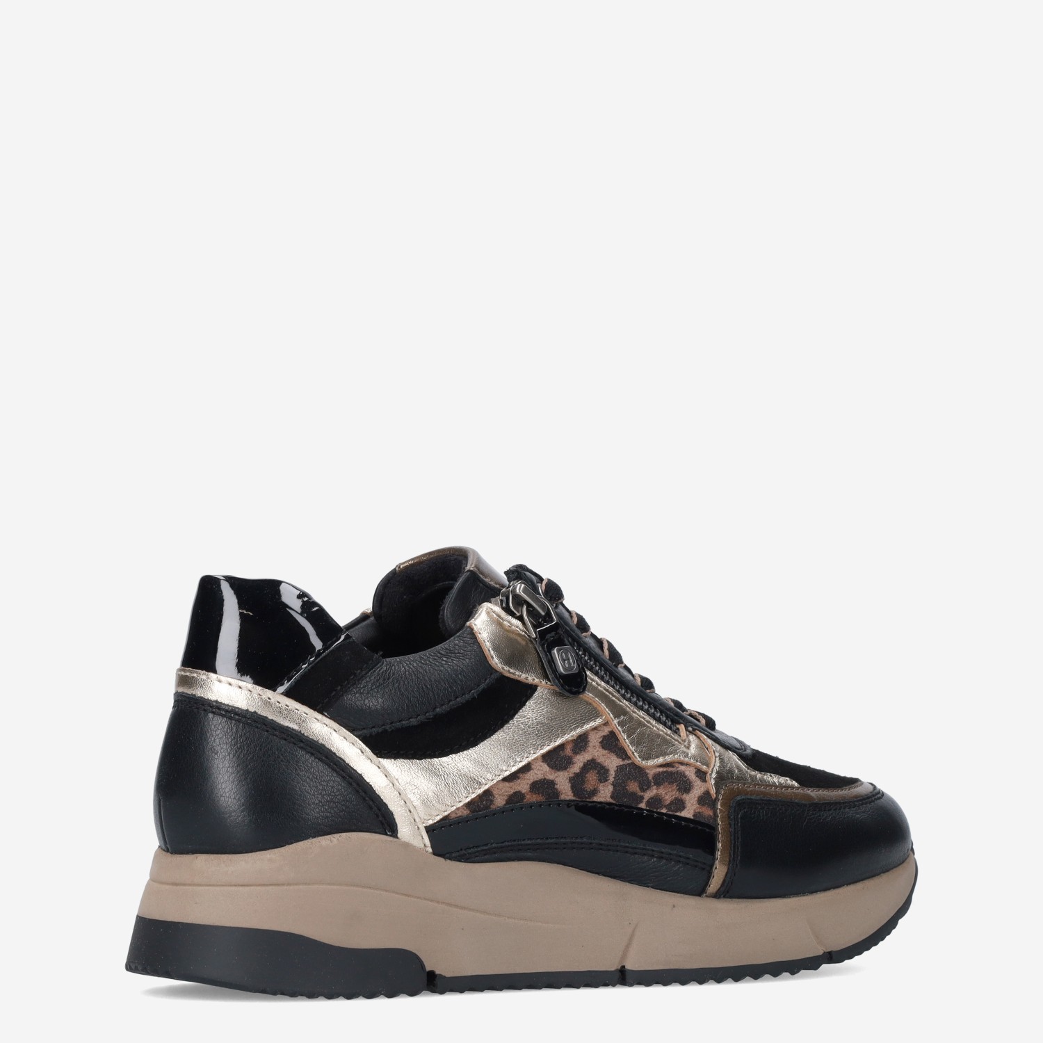 Deze zwart met gouden Sneaker H Leopard damessneaker van Helioform is gemaakt van leer in combinatie met synthetische materialen. De sneaker is voorzien van zowel een rits- als vetersluiting voor een gemakkelijke instap en heeft een panterprint design.