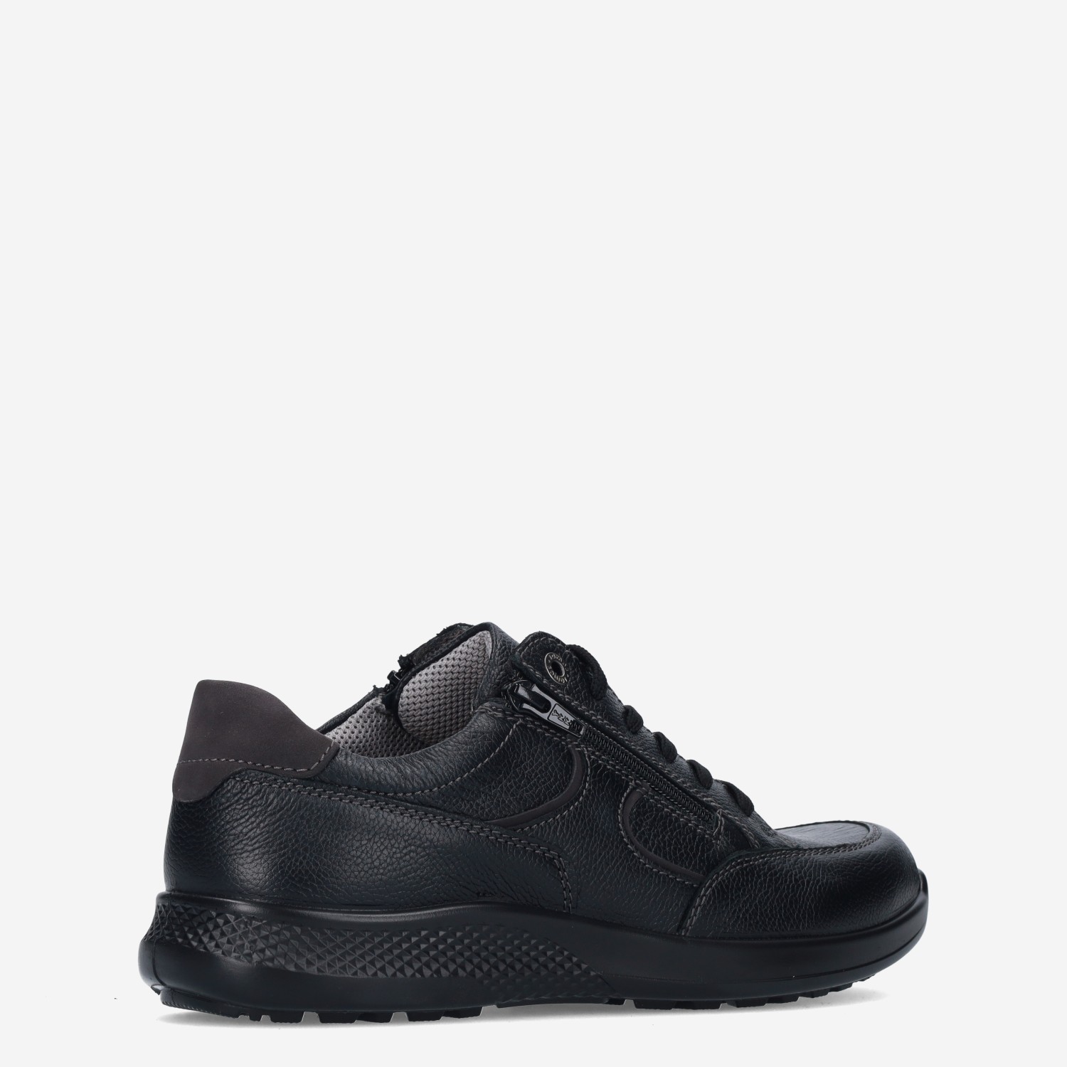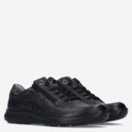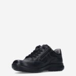 Deze zwarte herenschoen van Jomos is gemaakt van leer in combinatie met synthetische materialen. De schoen is voorzien van zowel een rits- als vetersluiting voor een gemakkelijke in- en uitstap en heeft schoenwijdte K.