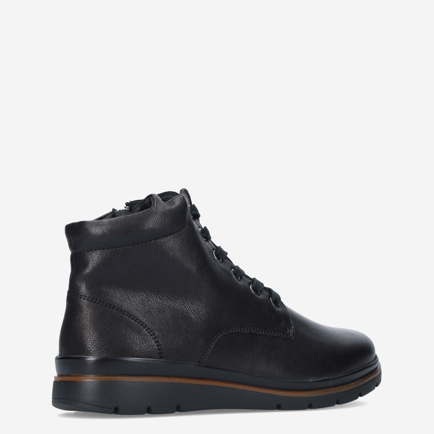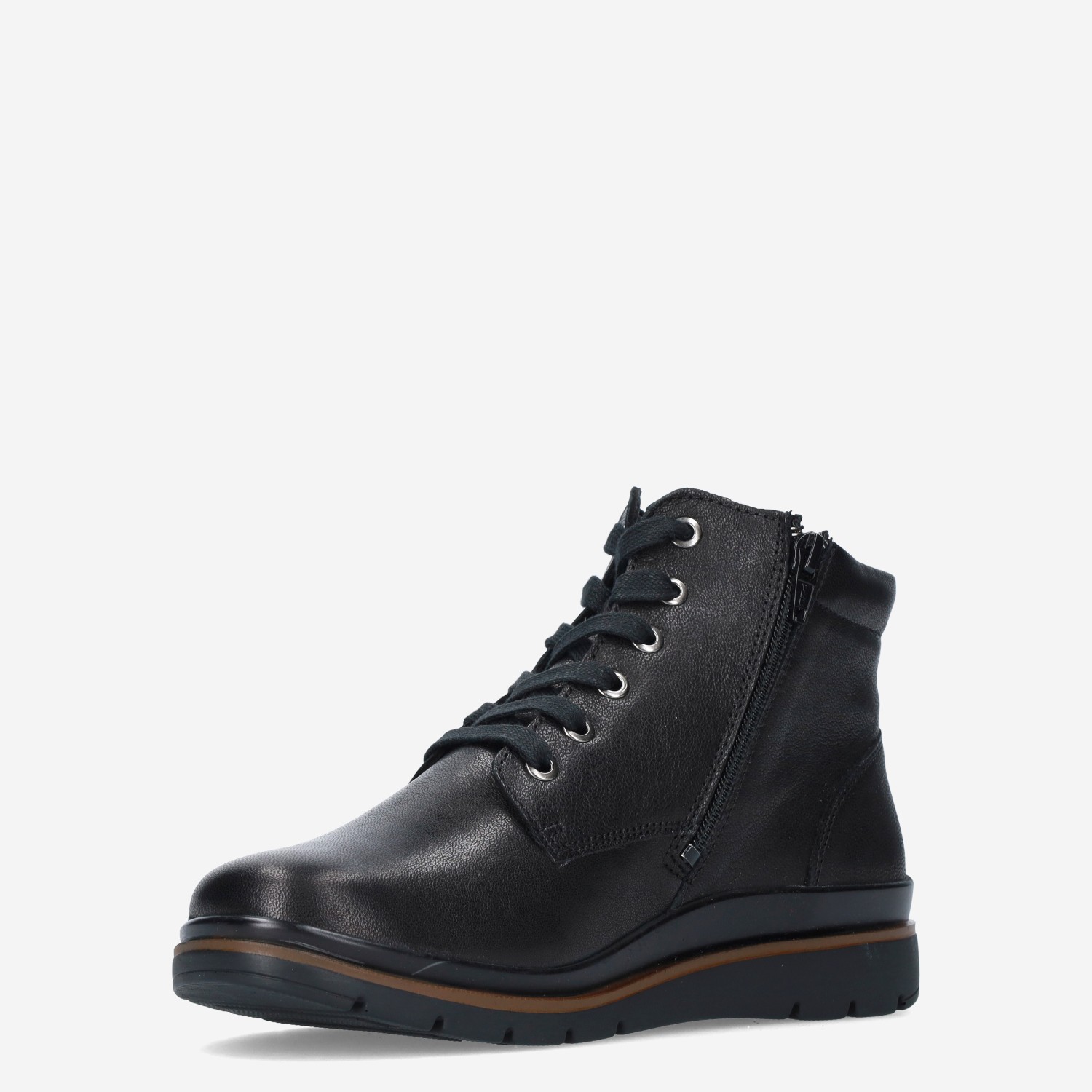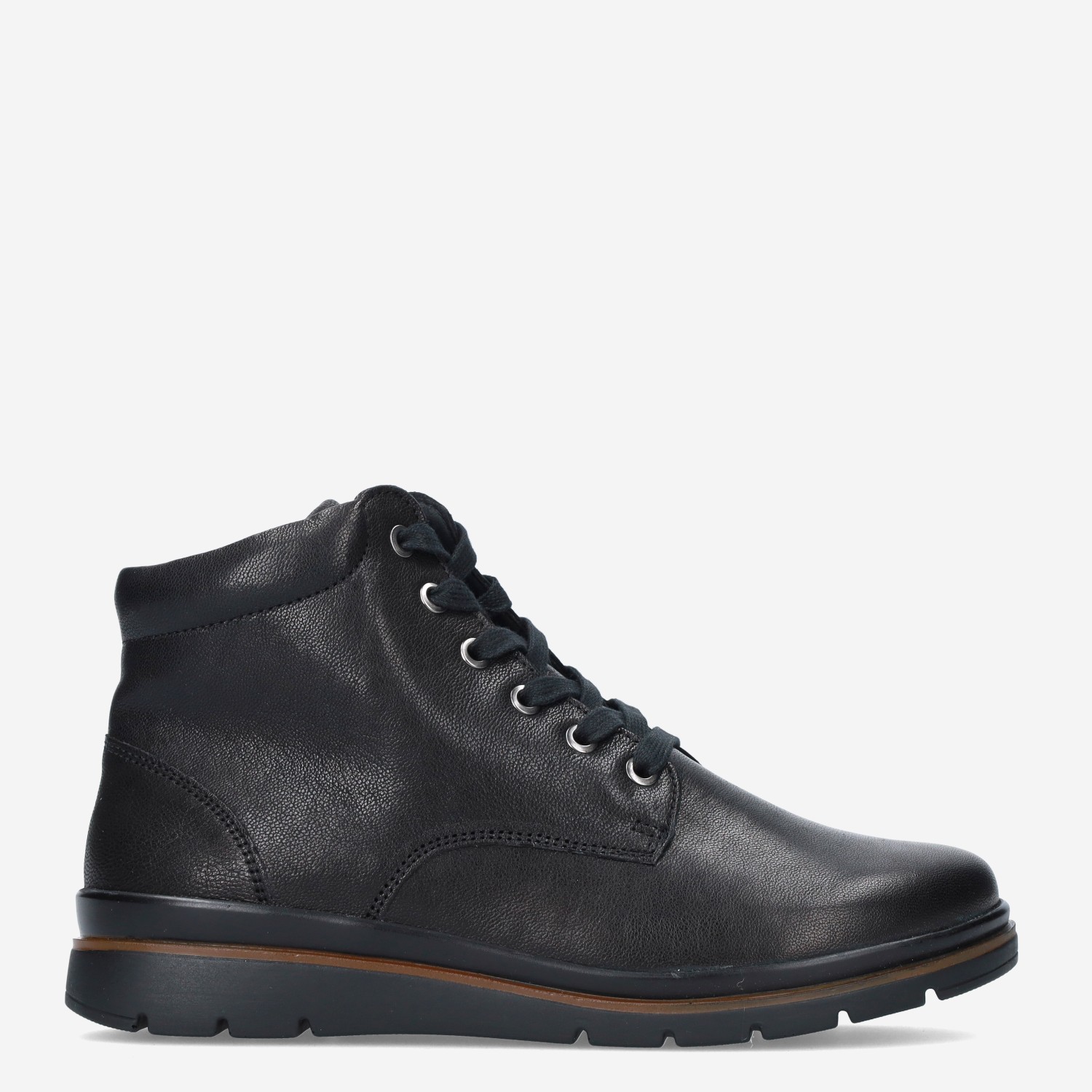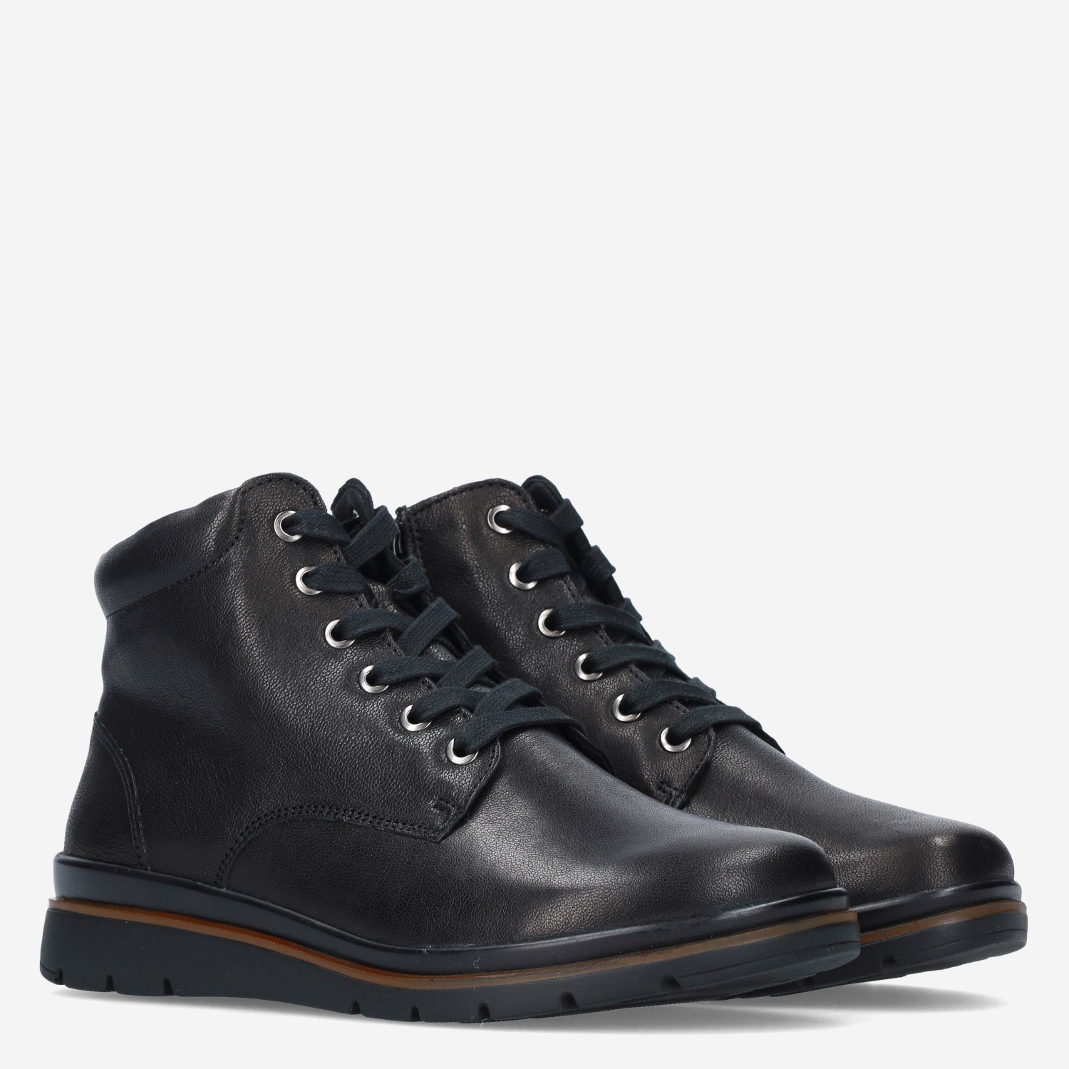 Deze zwarte Stiefel damesschoen van Fidelio is gemaakt van verschillende leersoorten en is voorzien van zowel een rits- als vetersluiting voor een gemakkelijke instap. De boot heeft een warme textielvoering.