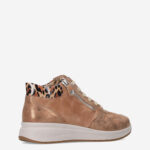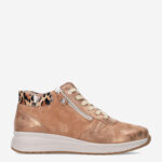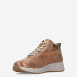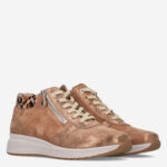 Deze beige Stiefel Nuez damesschoen van Fidelio is gemaakt van verschillende leersoorten en is voorzien van zowel een rits- als vetersluiting voor een gemakkelijke instap. De hoge sneaker heeft een brede leest en een panterprint design op de hiel van de schoen.