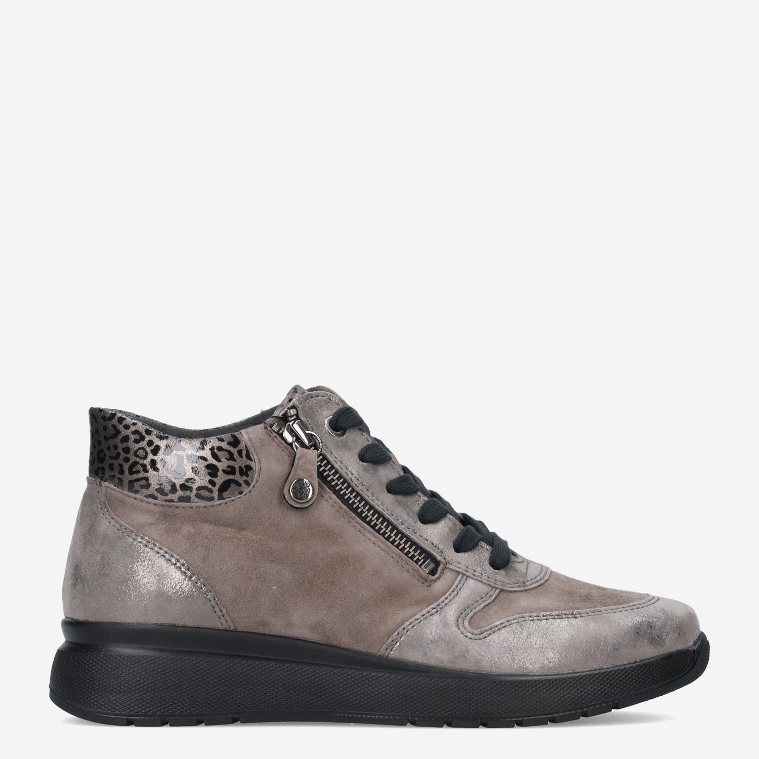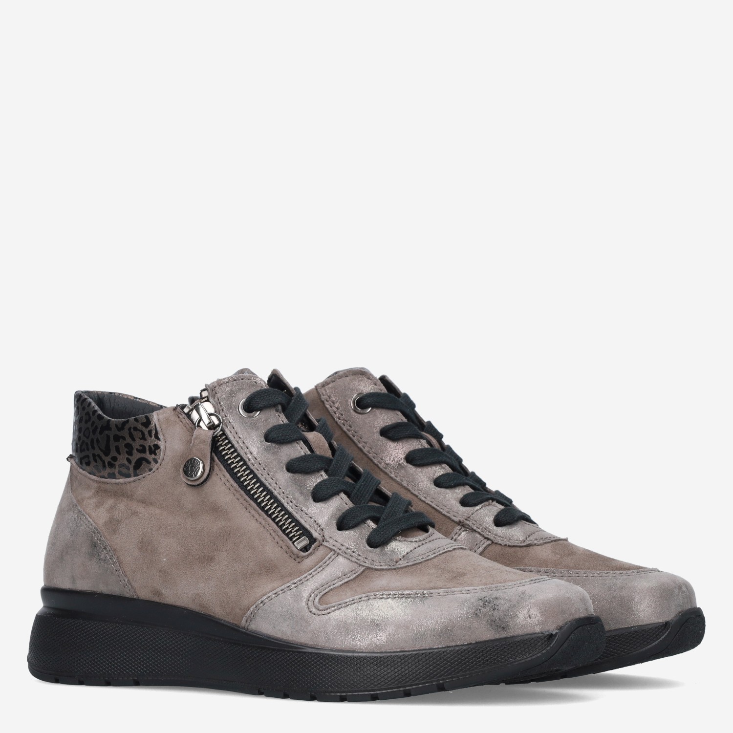 Deze Grijze Stiefel. Umba damessneaker van Fidelio is gemaakt van verschillende leersoorten en is voorzien en is voorzien van zowel een rits- als vetersluiting voor een gemakkelijke instap. Verder is de schoen voorzien van een brede leest.