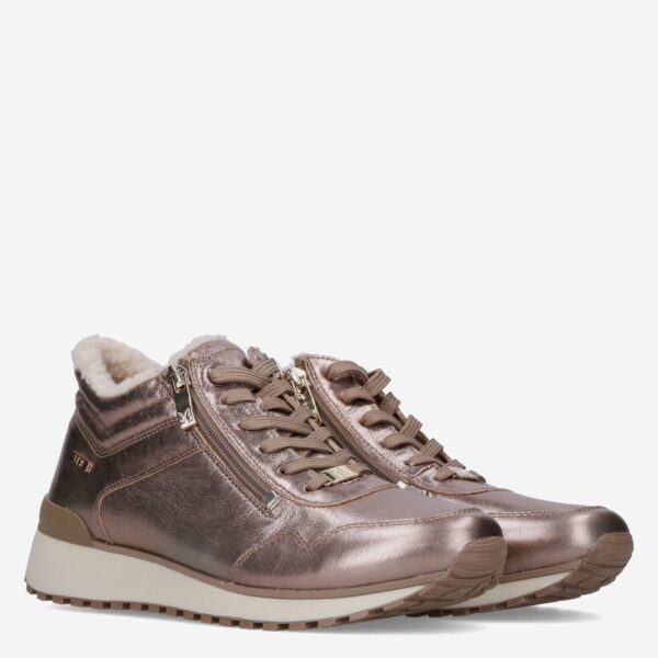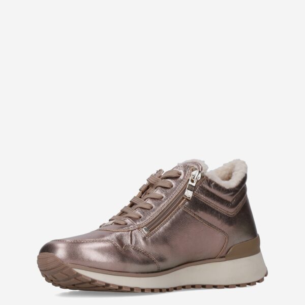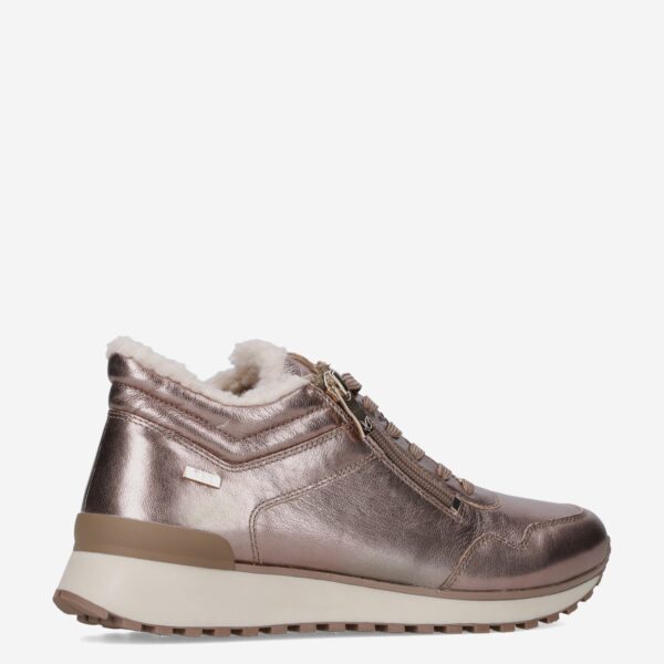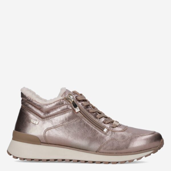 Deze bruine, metallic Strech damesschoen van Caprice is gemaakt van leer in combinatie met synthetische materialen. De hoge sneaker is voorzien van zowel een rits- als vetersluiting voor een gemakkelijke instap en heeft een zachte binnenvoering.