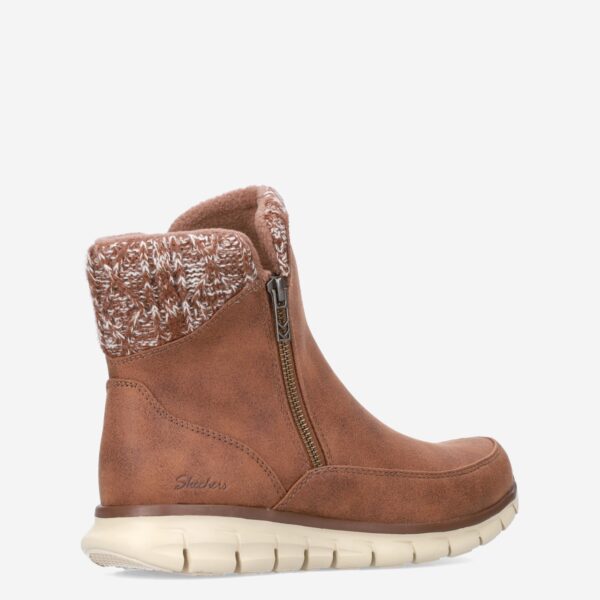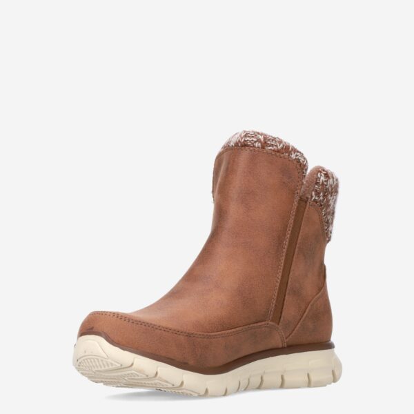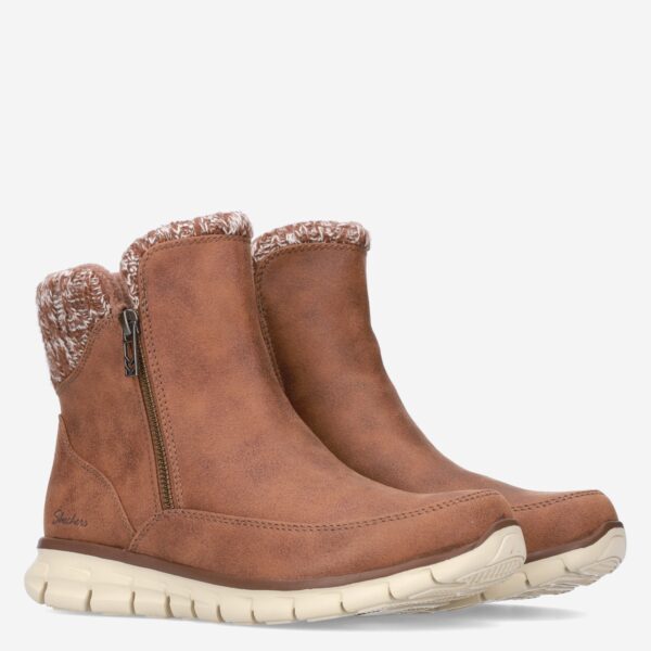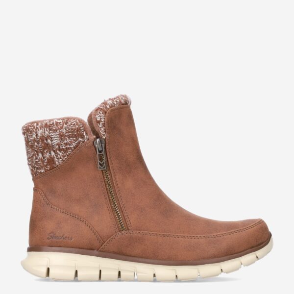 Deze bruine Synergy damesschoen van Skechers is gemaakt van imitatieleer en textiel in combinatie met synthetische materialen. De boot is voorzien van een ritssluiting en heeft een warme binnenvoering.