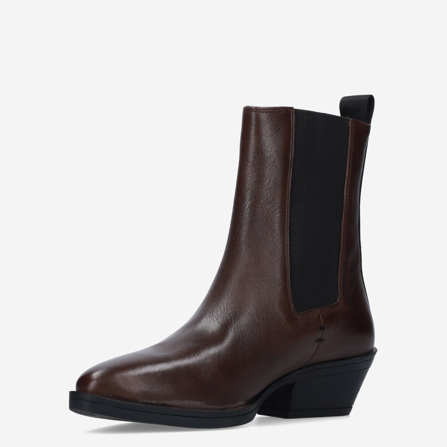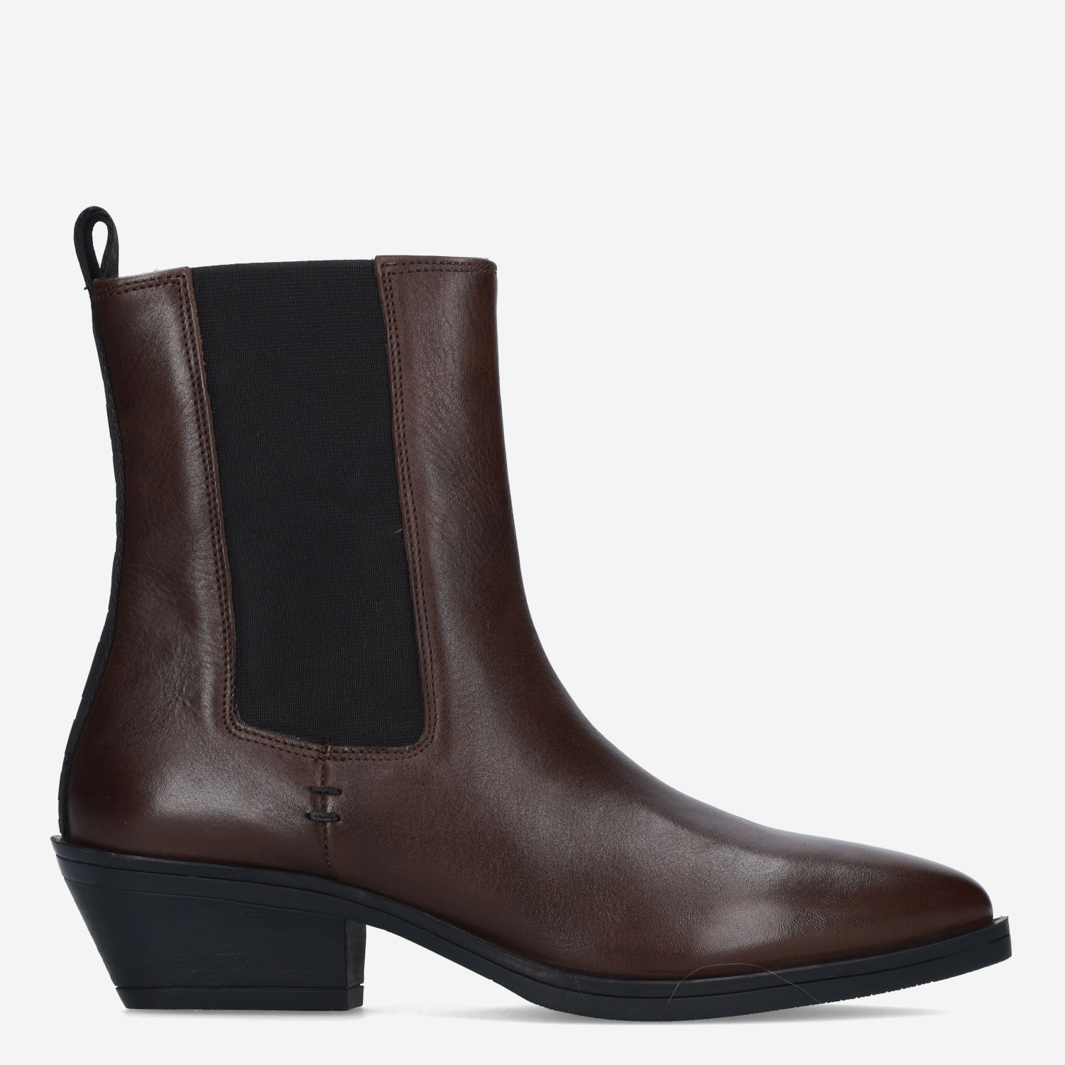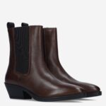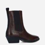 Deze kastanje bruine Terra damesboot van Maruti is gemaakt van leer in combinatie met synthetische materialen. De enkellaars is voorzien van een elastieken tussenstuk en heeft een hakhoogte van ongeveer 3 centimeter.