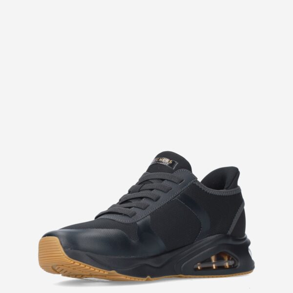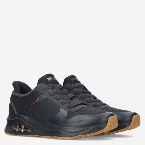Deze zwarte Tres-Air Uno Slip-Ins herensneaker van Skechers is gemaakt van imitatieleer in combinatie met synthetische materialen. De sportieve sneaker is voorzien van een luchtkussen voor extra demping en comfort en heeft een gemakkelijke instap.