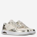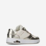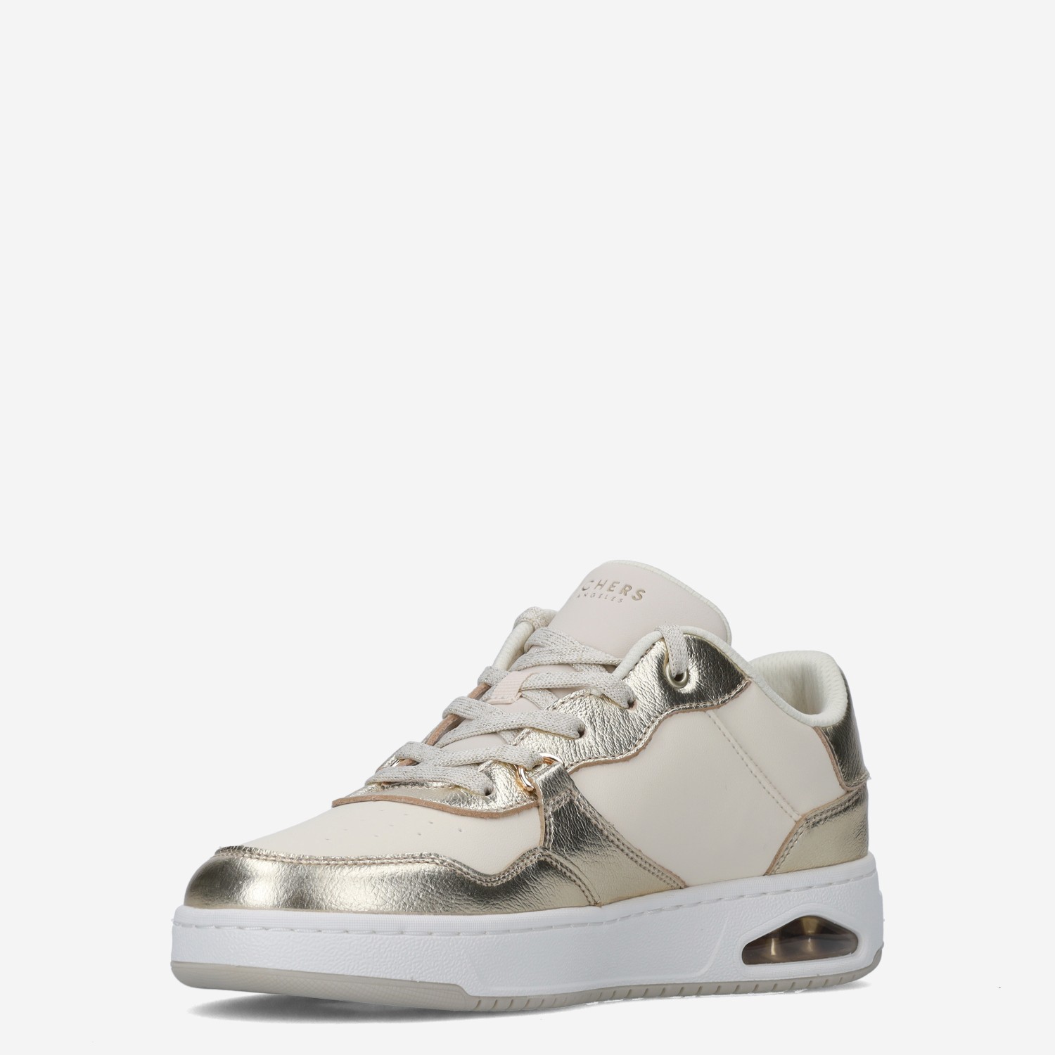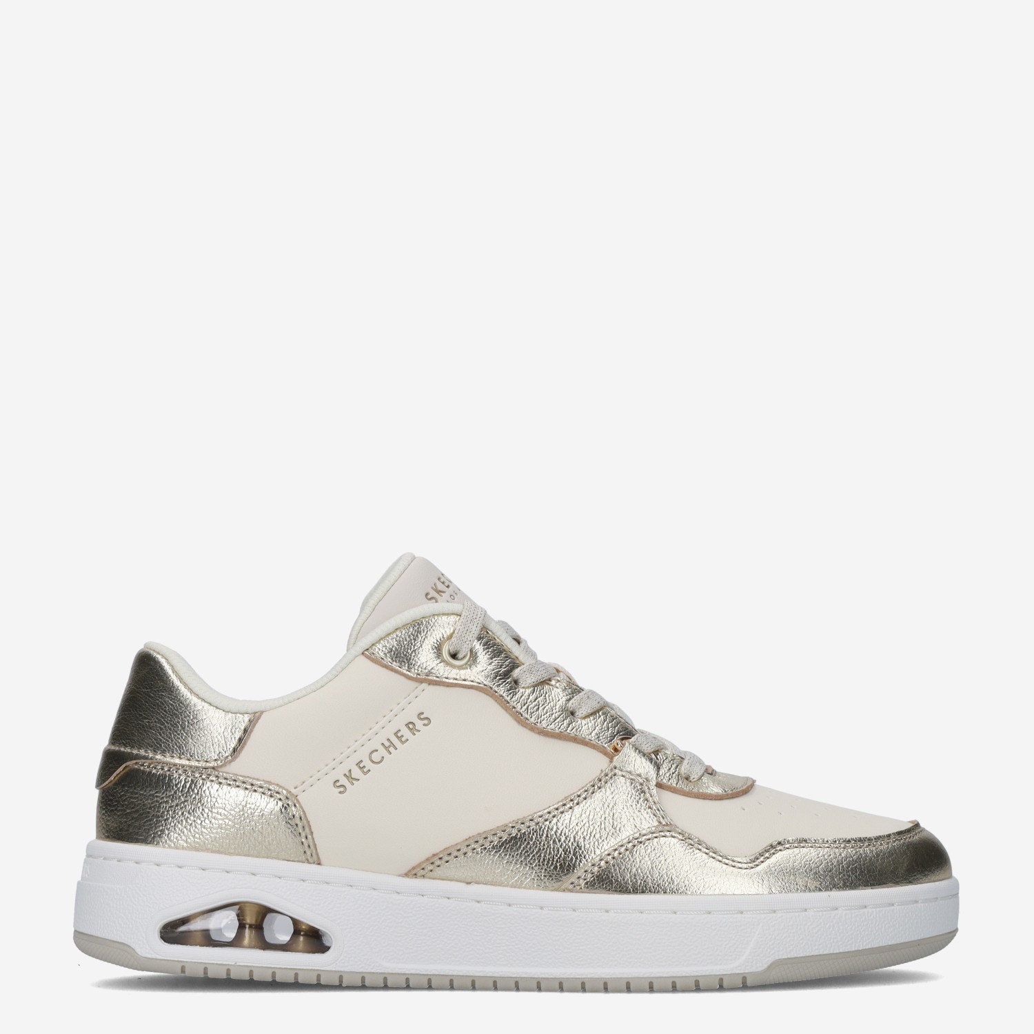 Deze offwhite, gouden Uno Luxe Steps damessneaker van Skechers is gemaakt van imitatieleer in combinatie met textiel en synthetische materialen.