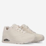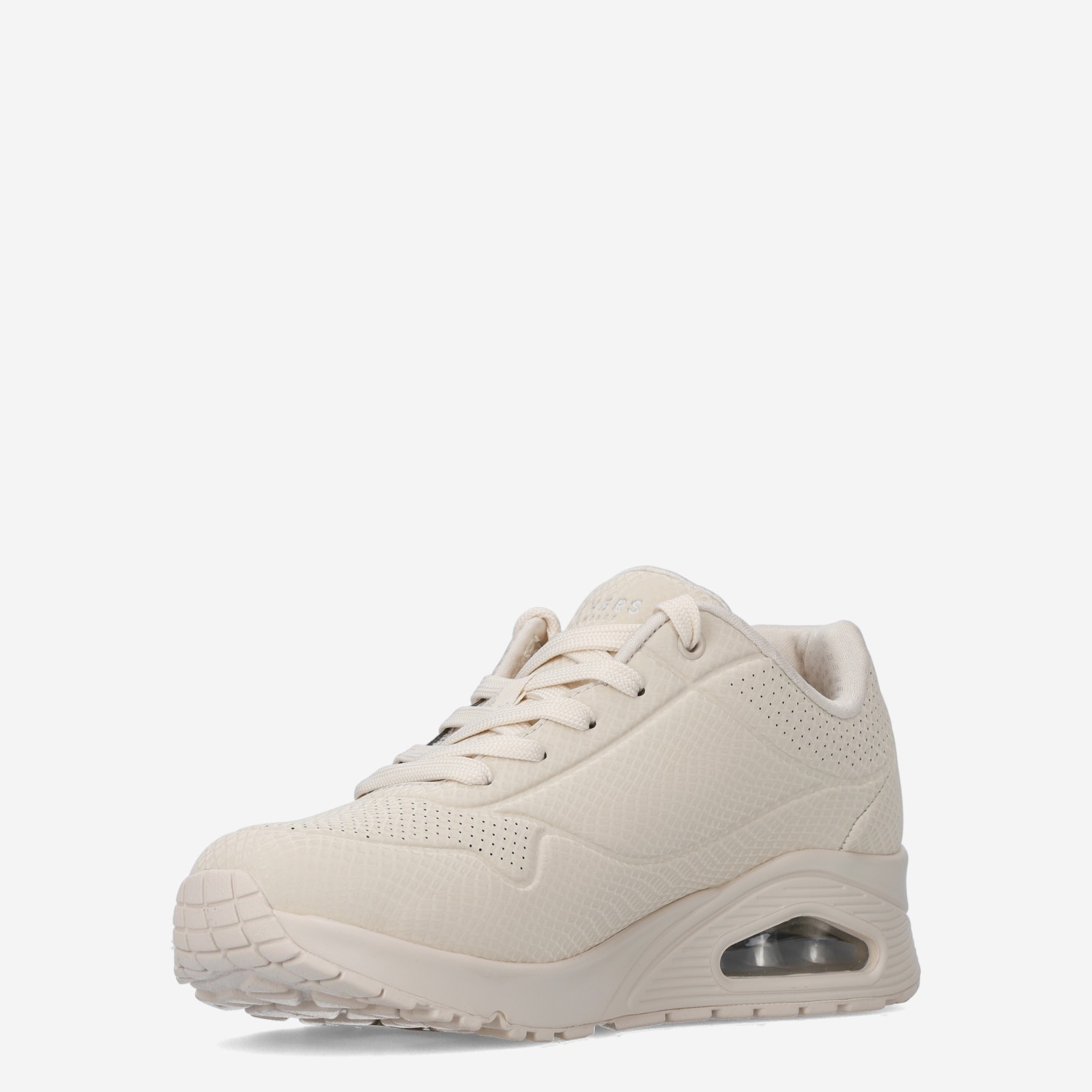 Deze beige Uno Shiny Scale damessneaker van Skechers is gemaakt van imitatieleer in combinatie met textiel en synthetische materialen. De sneaker is voorzien van een Air-Cooled Memory Foam binnenzool en heeft een licht glanzend design.