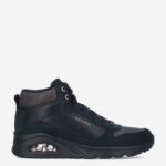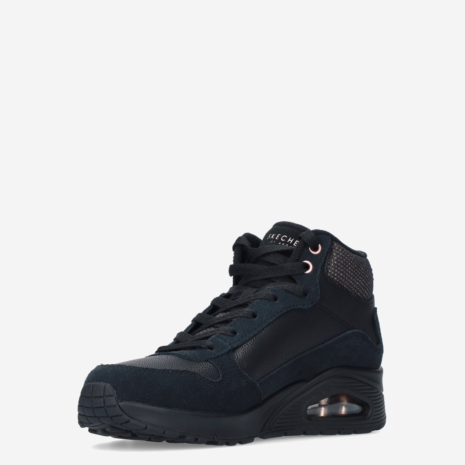 Deze zwarte Uno Stacre Shine damesschoen van Skechers is gemaakt van imitatieleer in combinatie met synthetische materialen. De hoge sportieve sneaker is voorzien van een lichtkussen voor extra demping en comfort.