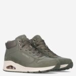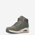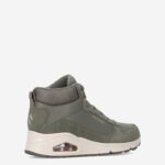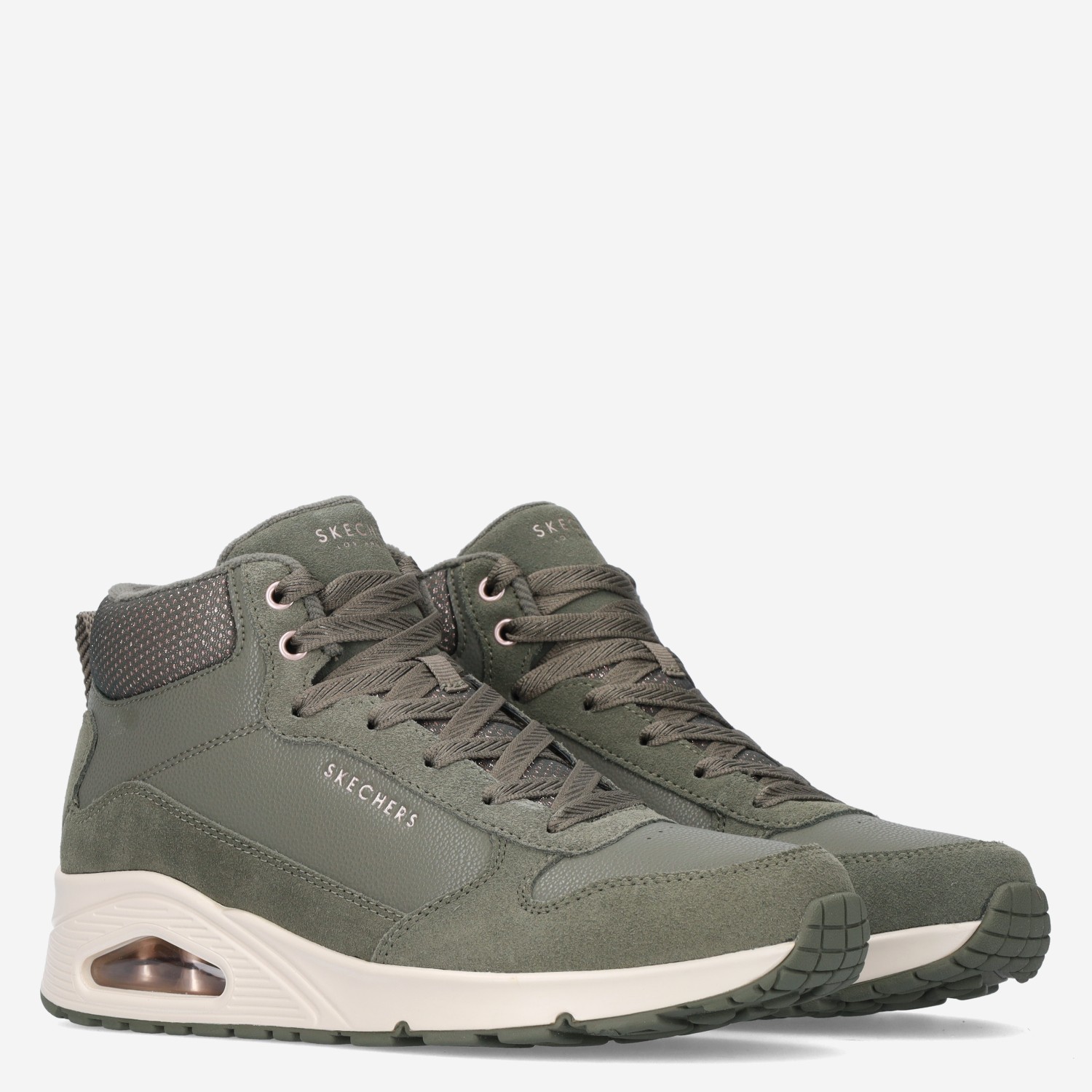 Deze groene Uno Stacre Shine damesschoen van Skechers is gemaakt van imitatie leer in combinatie met leer en synthetische materialen. Deze hoge sneaker is voorzien van een vetersluiting.