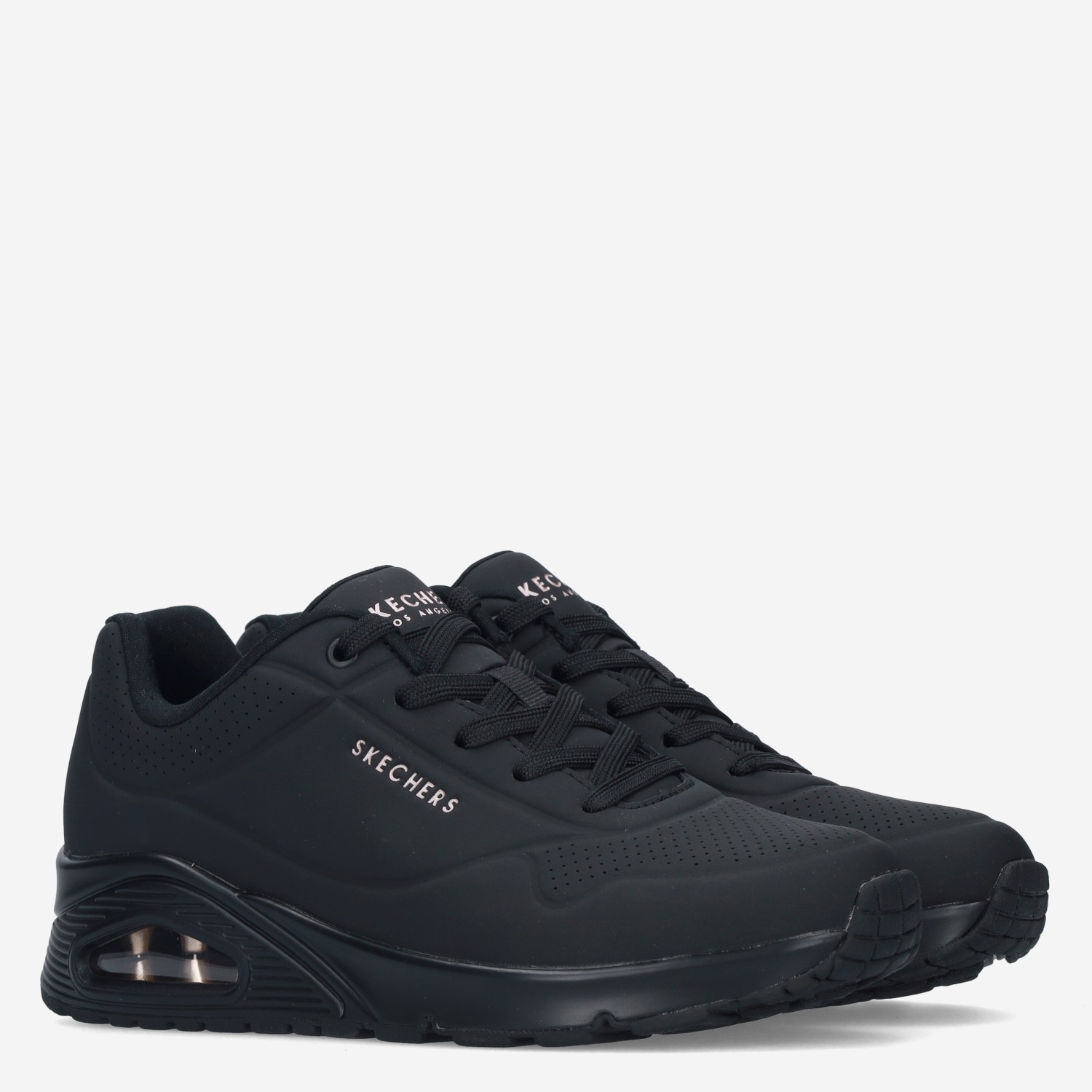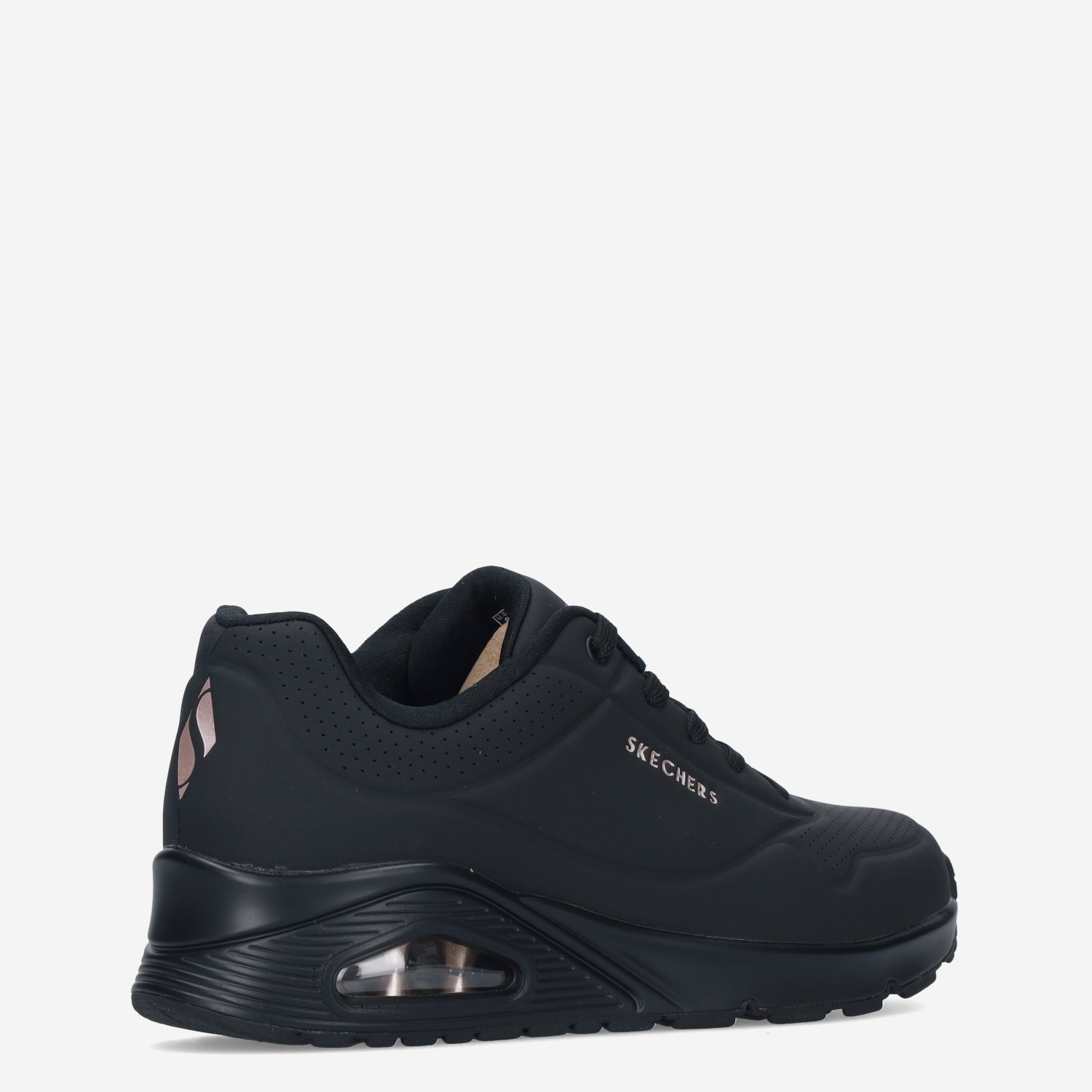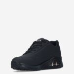 Deze zwarte Uno Stand On Air damessneaker van Skechers is gemaakt van imitatieleer in combinatie met textiel. De sneaker is voorzien van een verhoogde zool voor extra comfort.