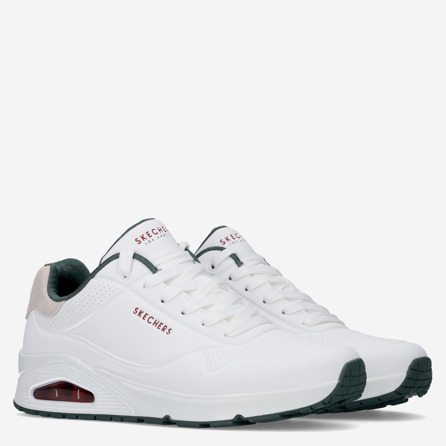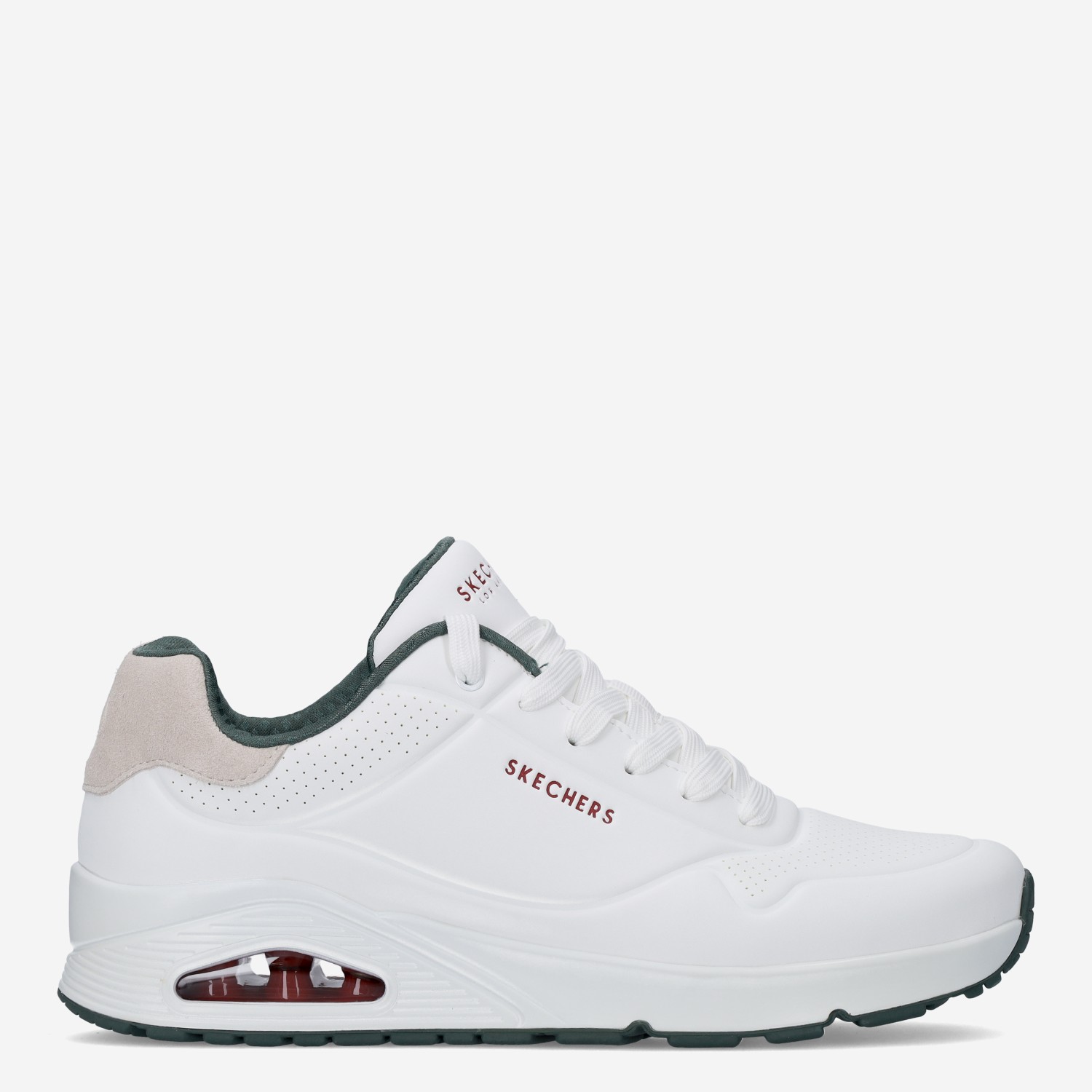 Deze witte Uno Suited On Air herensneaker van Skechers is gemaakt van imitatieleer in combinatie met suรจde. De sneaker is voorzien van een lichtgewicht zool met luchtkussen voor extra demping en comfort.