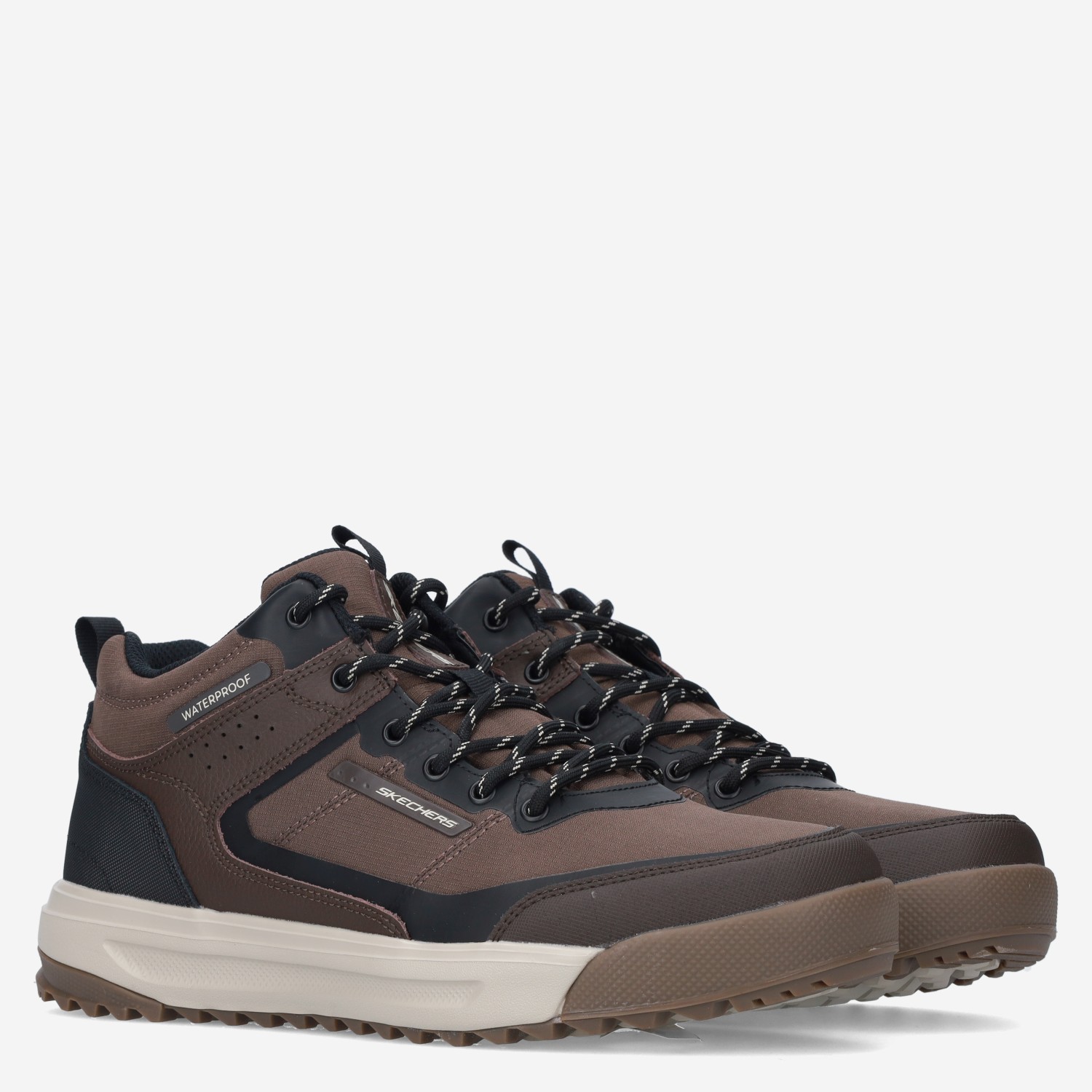Deze bruin met zwarte Urban Street Hiker herensneaker van Skechers is gemaakt van imitatieleer in combinatie met textiel en synthetische materialen. De hoge sneaker is voorzien van een waterproof membraan en heeft een sportieve zool.