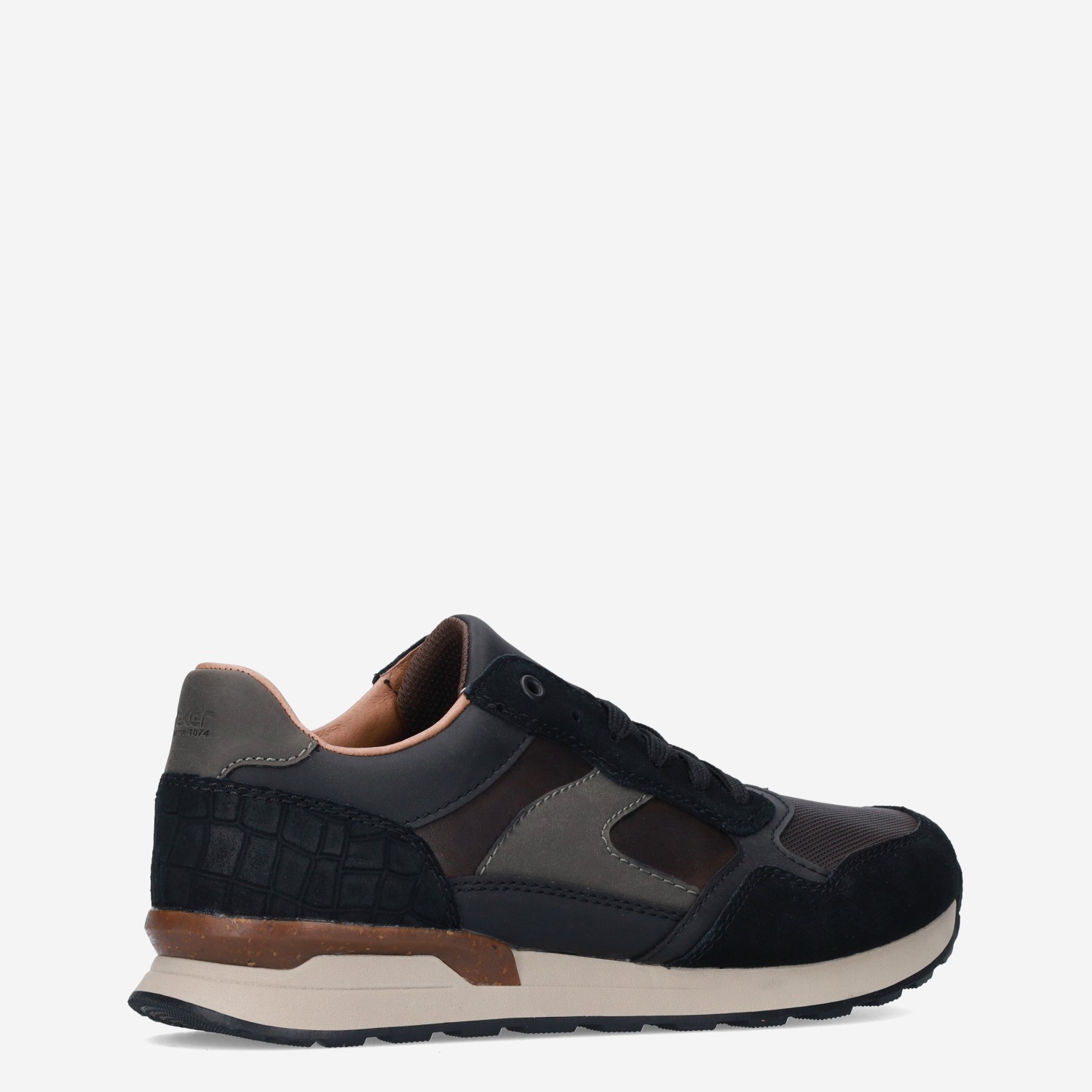 Deze zwarte multicoloured Usedcalf herensneaker van Rieker is gemaakt van leer in combinatie met textiel en synthetische materialen. De sneaker is voorzien van verschillende leren overlays.