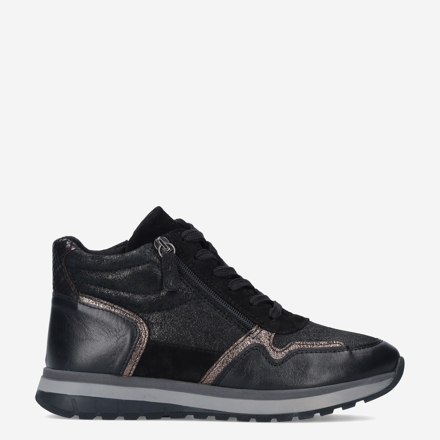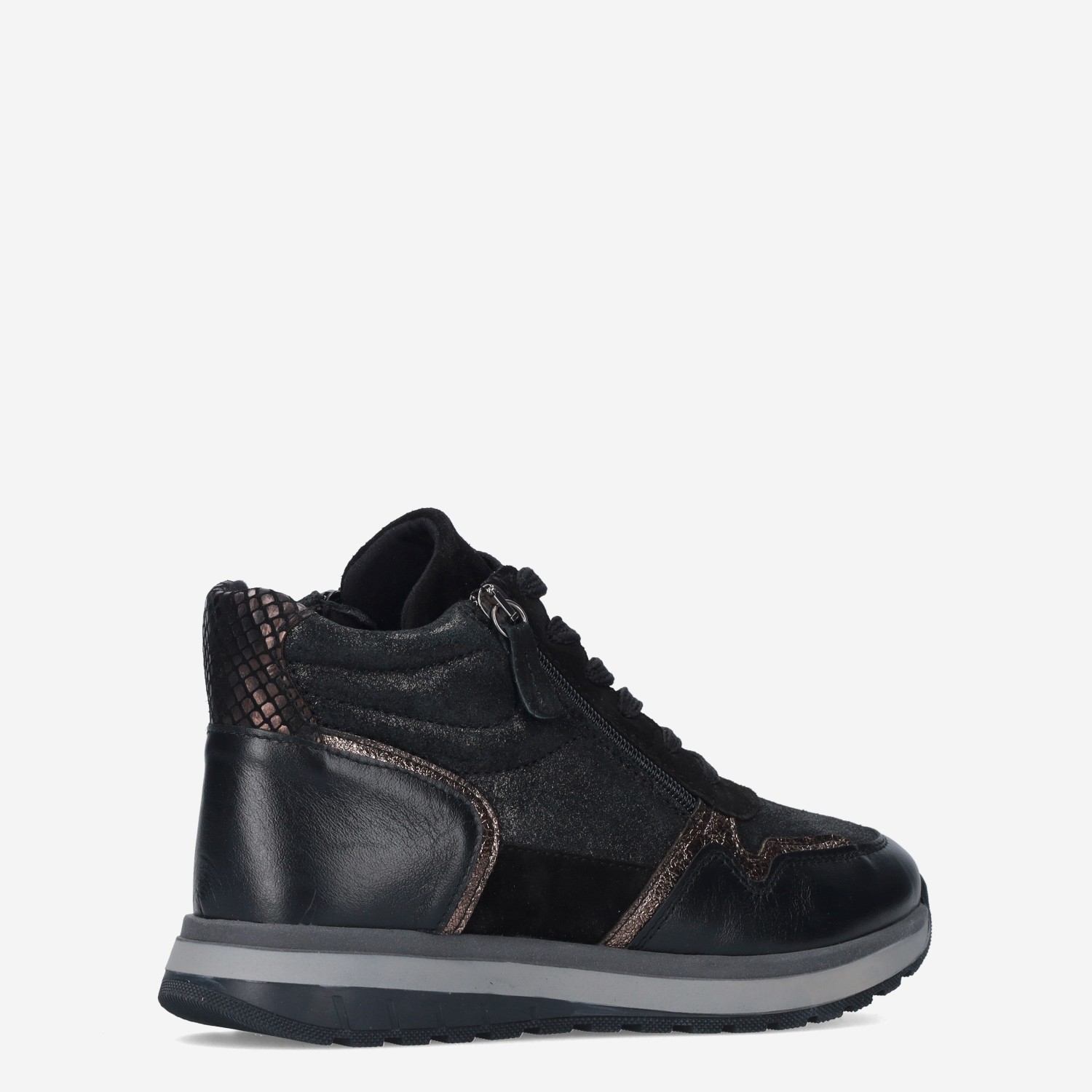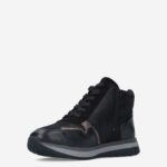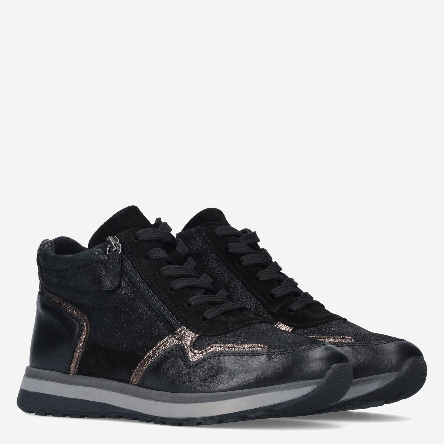 Deze zwarte Vivian Mid damesschoen van Aco is gemaakt van leer in combinatie met synthetische materialen. De halfhoge sneaker is voorzien van zowel een rits- als vetersluiting voor een gemakkelijke instap.
