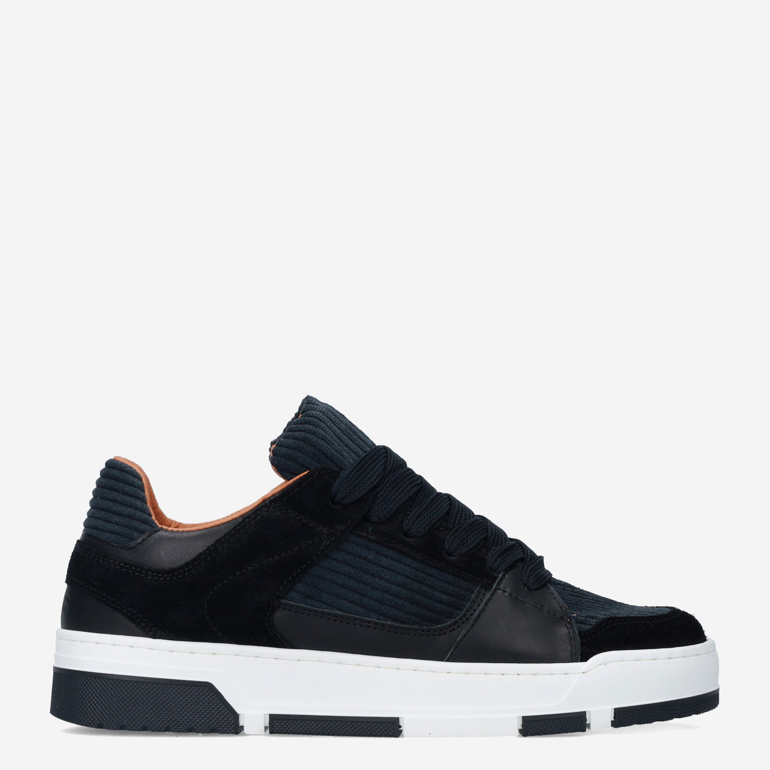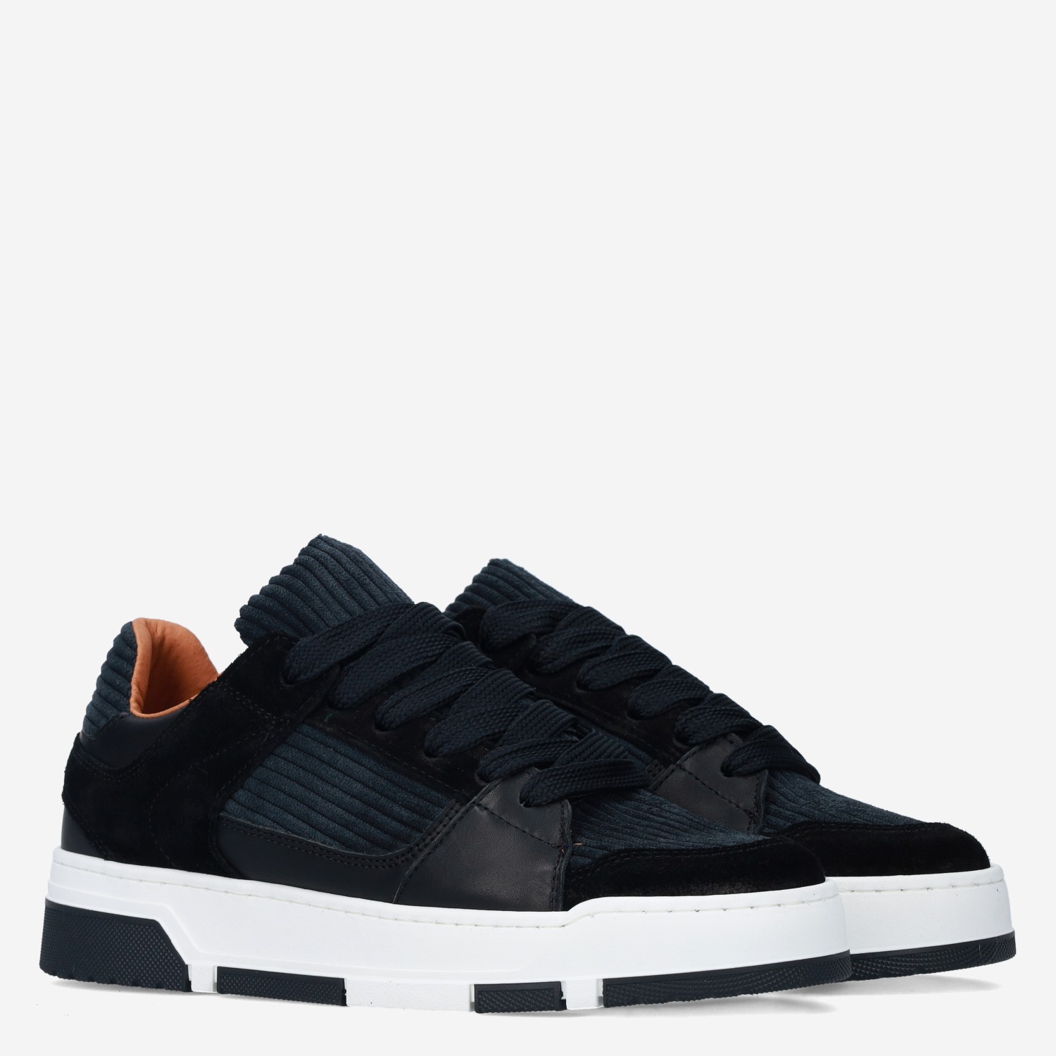 Deze zwarte Whitby Corduroy damessneaker van DWRS is gemaakt van verschillende leersoorten in combinatie met textiel en synthetische materialen.